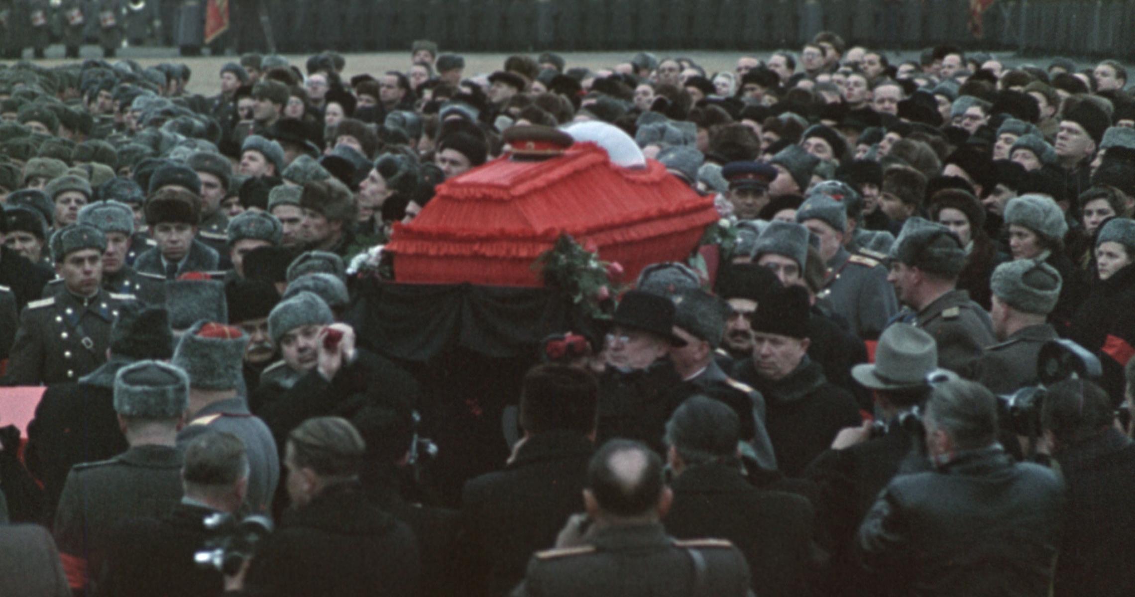 Moscova, martie 1953. Coloane întregi de oameni așteaptă la rând pentru a aduce un ultim omagiu defunctului conducător sovietic. O voce tandră de bărbat răsună din difuzoare, învăluind mulțimea cu vorbe de dor și regret pentru cel dispărut. Niște muncitori cocoțați pe o schelă privesc la portretul imens al dictatorului, levitând deasupra lor decorat cu stegulețe roșii. Acestea sunt doar câteva episoade din marele spectacol al funeraliilor lui Iosif V. Stalin, o imensă mașinărie menită să amplifice ecoul terorii și al minciunii și să continue cultul personalității, chiar și dincolo de moarte.